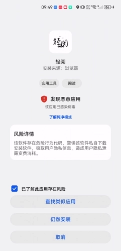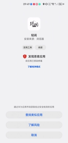2、系统检测到恶意应用,不排除是误判的可能,建议点击“了解风险”查看详情。