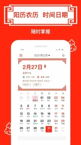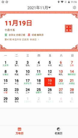 •提供公历与农历日期,支持万年历查询功能,便于用户查看过往及未来的日期。