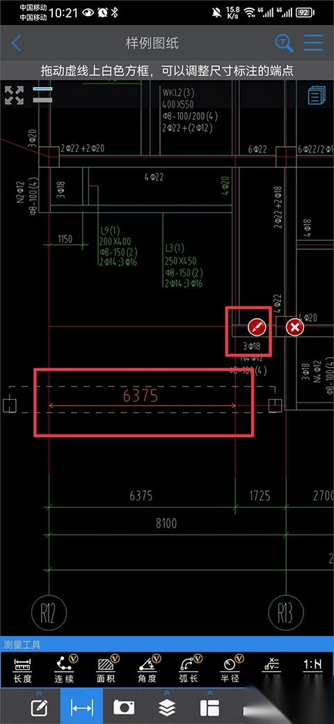 在图纸上长度的两端分别点击确定一点,系统即可自动测量出相应长度。若您需要切换标注颜色,点击笔形图标即可进行操作。