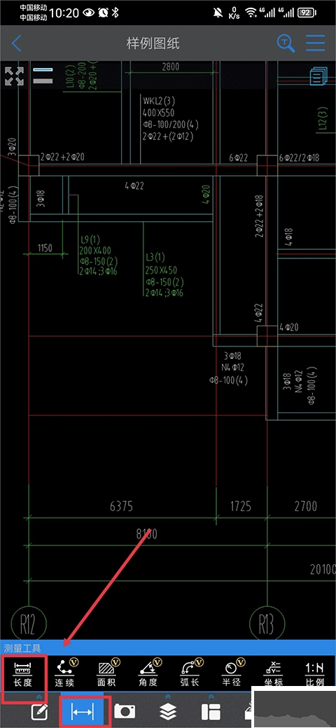 进入图纸页面后,把图纸调整到合适的放大比例,接着在页面下方的功能区域里找到测量工具选项,点击其中的“长度”测量功能按钮。