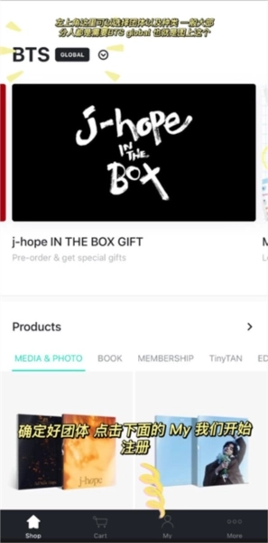 1、左上角这里可以选择团体以及种类,一般大部分人都是需要BTSglobal,也就是图上这个,确定好团体,点击下面的MY,我们就开始注册