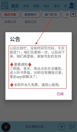 答:请检查是否开启读写权限,因为历史记录保存在手机根目录“昊昊听书”文件夹,里面会有HHTS.ini和LSJL.ini文件。如果有这两个文件,退出软件,重启即可。