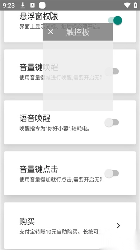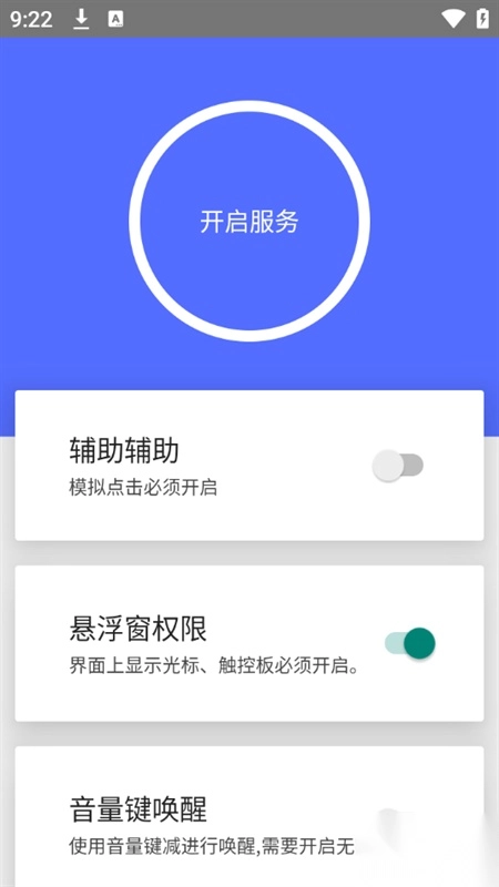 界面设计简洁明了,只需一键就能启动服务。使用前请按照提示开启辅助功能和悬浮窗权限,待界面上出现光标后,就可以进行操作了。