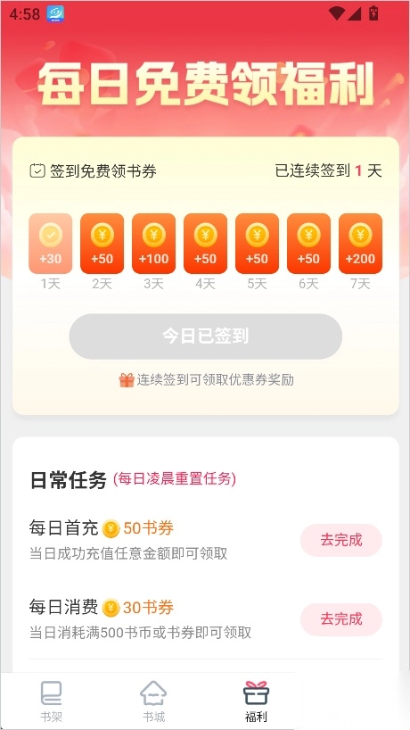 每天签到就能领取免费书券,福利多多!邀请好友还能拿到更多奖励,看书更划算。