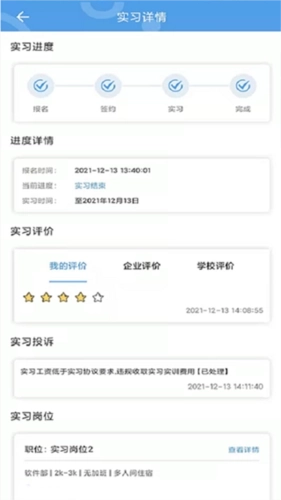 学生实习过程中可根据实际情况选择对企业进行评价,学校核实投诉内容后对企业进行处理,确保学生实习安全。