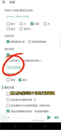 3、进入“设置”页面后,找到“音乐来源”板块下的“自定义源管理”选项。