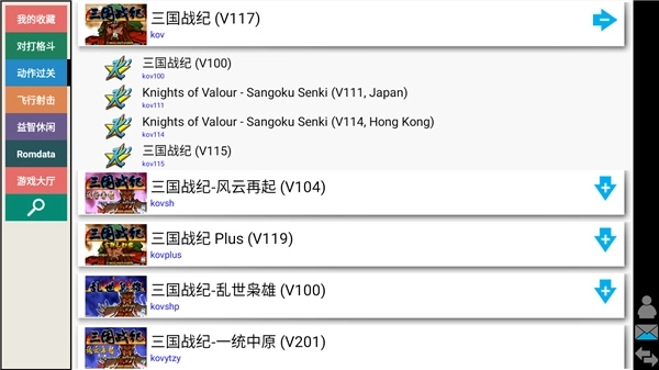 1、运行Kawaks街机模拟器手机版后如下图所示,包含了对打格斗、动作过关、飞行射击、益智休闲等;