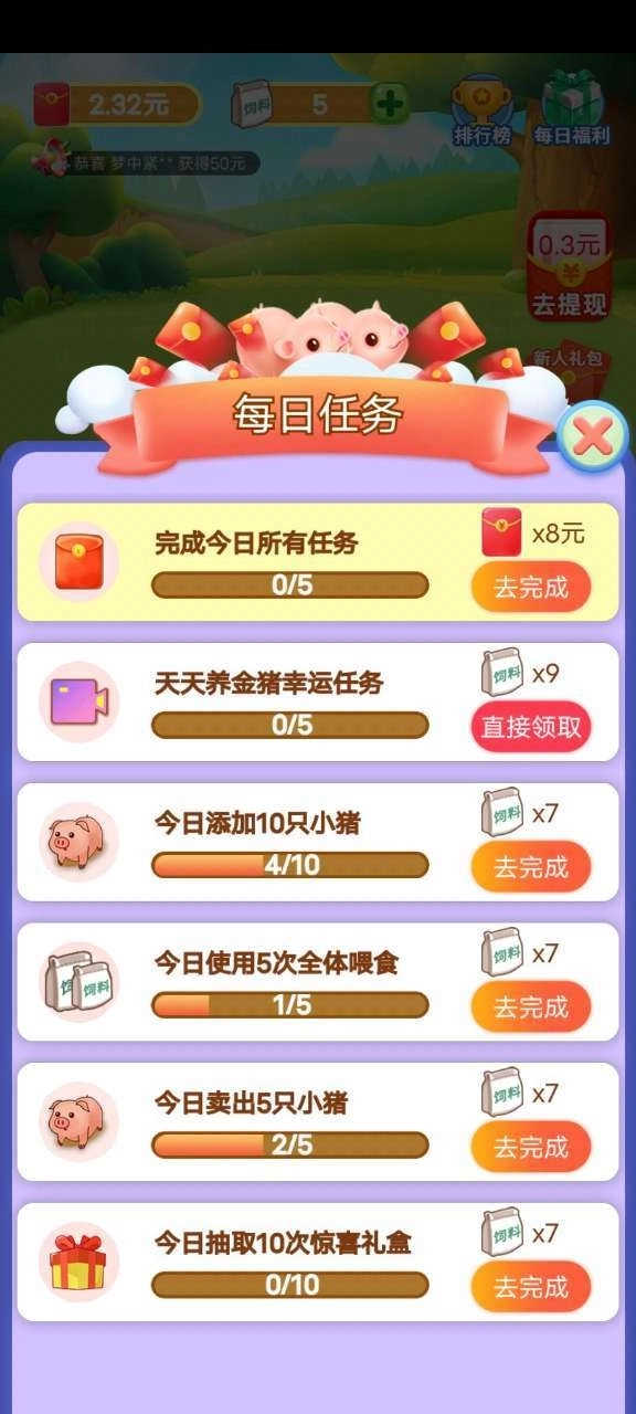 4.游戏中提供了多样的小猪种类供玩家收集与喂养,持续培养这些小猪能够帮助提升你的财富值。