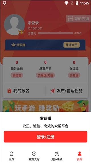 1、第一步先打开赏帮赚的最新版本,接着点击“我的”按钮完成注册和登录操作。