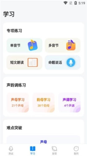 2、点击学习,可以看到各种专项练习、声韵调练习以及难点突破等