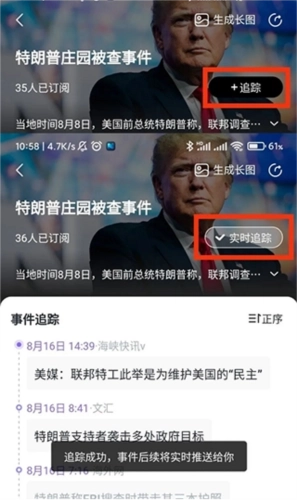 对于您感兴趣的新闻事件,可以通过便捷的追踪按钮进行订阅,确保在第一时间将事件的最新进展通知给您,无需花费力气自行寻找,所有事件尽在掌握。
