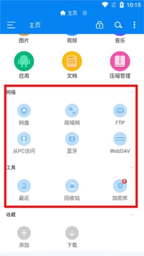 4、在软件的侧边栏当中,我们能够非常清晰的看到存储、网络、收藏等功能;