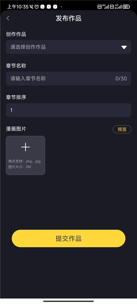 3、录入作品名称、漫画类别、漫画封面、简介等相关信息。