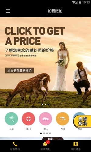 铂爵旅拍是铂爵旅拍文化有限公司研发的婚纱摄影软件,致力于为用户提供优质服务。用户可预约知名摄影师,享受专业拍摄服务,提升拍摄体验;还能定制专属拍摄方案,选择心仪风格。软件全面选用国际知名礼服与彩妆品牌,为客户提供星级酒店免费住宿,且在全球100多个城市设有旅拍地点,覆盖全球大部分地区,方便用户前往喜爱的城市拍摄。