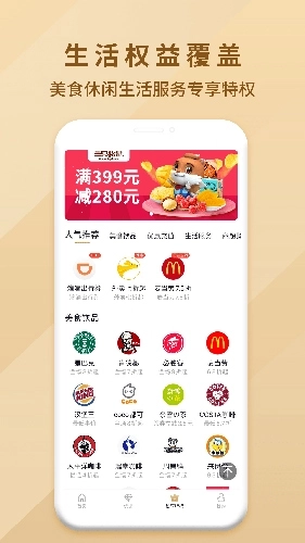 2.美团外卖、饿了么的折扣券与红包可每日领取,肯德基、麦当劳、汉堡王等餐饮品牌用餐享5折起优惠,还有下午茶超值折扣,以及各类美食、美妆、休闲娱乐等权益服务,覆盖“吃喝玩乐、衣食住行”等生活各领域的折扣特权;