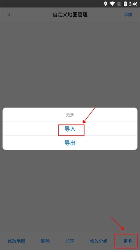 4、接着在自定义地图管理界面点击右下角的更多功能选项,再点击导入按钮