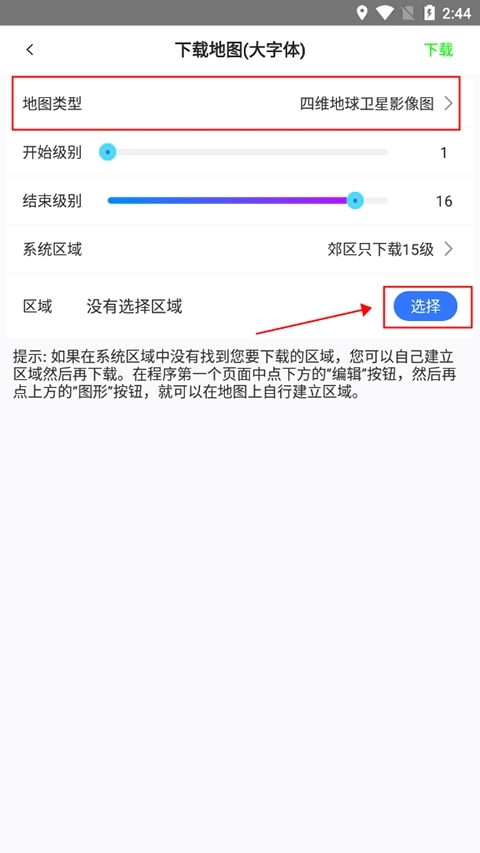 3、接着选择好地图类型后,再点击区域选项右侧的选择功能