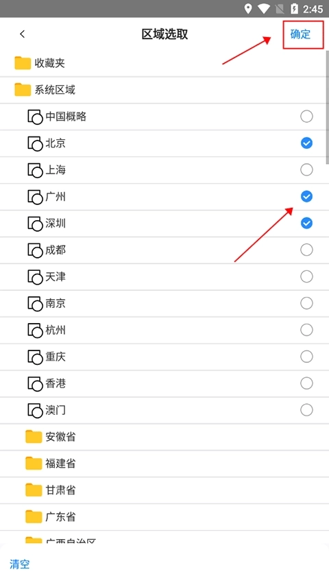 4、接着在区域选择界面勾选你所需的区域(支持多选),勾选完成后点击确定按钮。