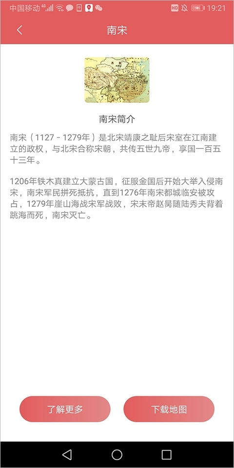 用户挑选一个朝代并点击进入后,就能查看该朝代的简要介绍,点击【地图】按钮即可跳转至本地地图页面。