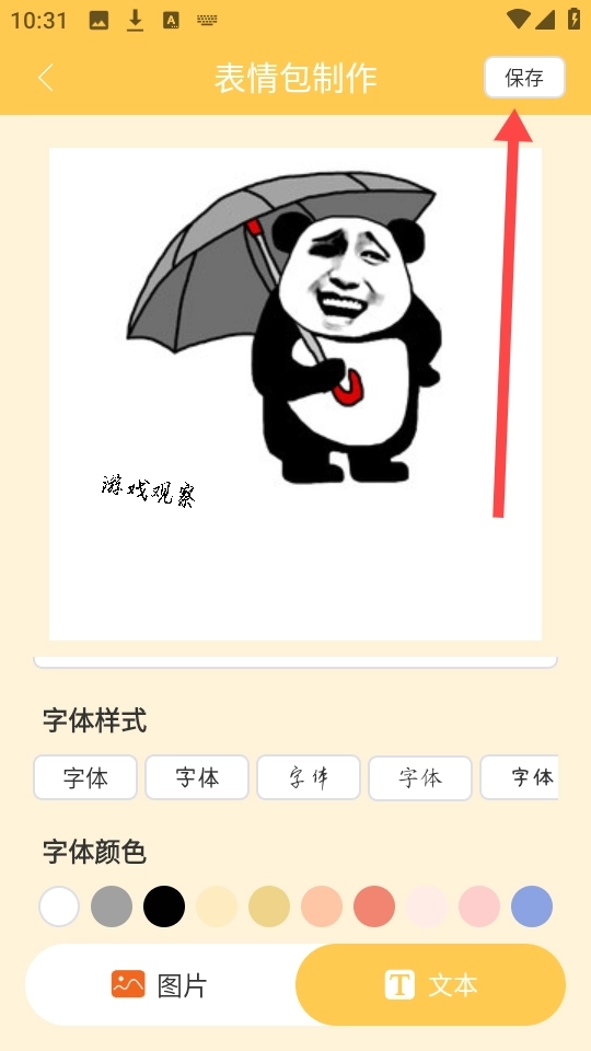 4、添加文字内容时,可对字体样式、颜色和位置进行调节,编辑完成后点击右上角的“保存”按钮即可。