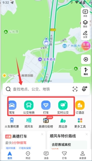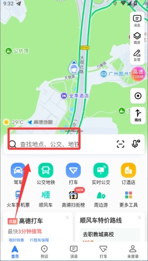 打开高德地图首页后,在页面底部的搜索框里输入你要找的地点名称来进行搜索。