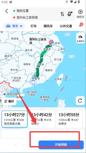 2、挑选驾车、公交等出行方式,查看系统推荐的若干路线后从中选定一条。