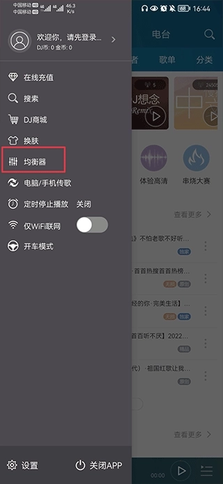 一、打开DJ音乐盒,在主界面点击左上角菜单图标