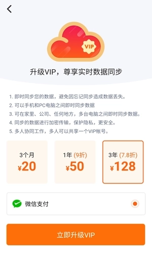 这样才会完成同步显示文字内容,我们也可以升级VIP,尊享实时数据同步,3个月20元,3年128元,支持微信支付。