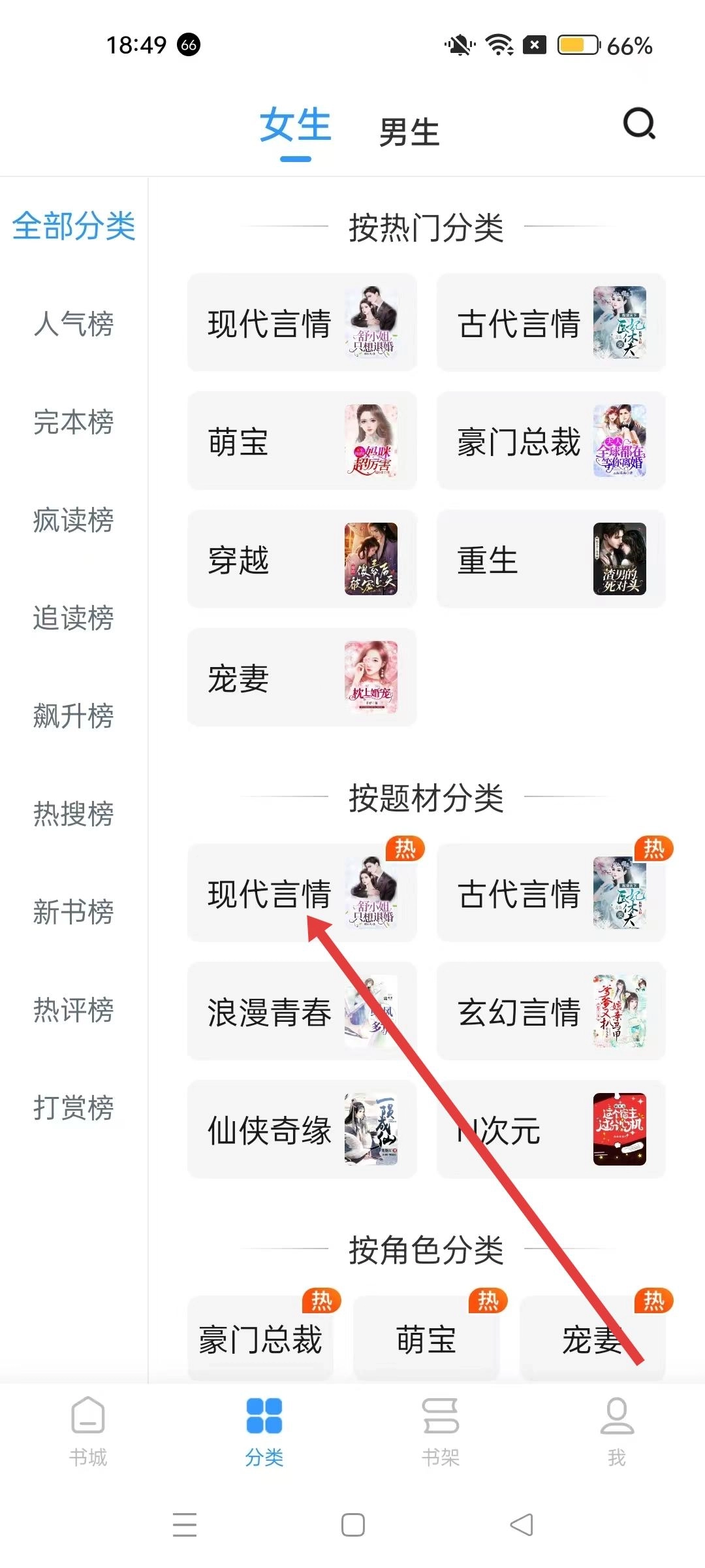 4、在分类界面中,当用户选择女生标签后,能够依据热门程度、题材类型、角色设定等不同维度来查找小说;若点击现代言情这一分类,即可浏览该分类下的小说列表。
