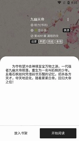 2、搜索结果显示后,点击进入查看小说详情,页面会列出多个网站提供的阅读源供你挑选。
