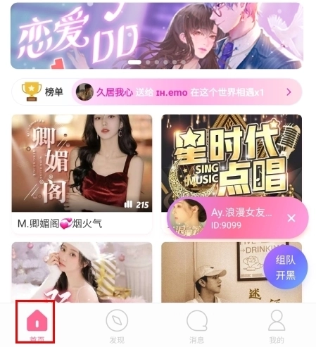 1、在首页中点击进入房间;