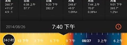 -太阳和月亮的方位及高度、日出日落、阴影比、月出月落、月相及照明%、曙/暮光时间、夏/冬至太阳路径、春/秋分太阳路径、黄金时段、蓝色时段、过中天等