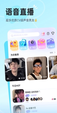 低沉磁性、阳光活力、傲娇少年音,锁定你喜欢的声音,与TA在线连麦,感受声音在耳边悦动的心动瞬间!