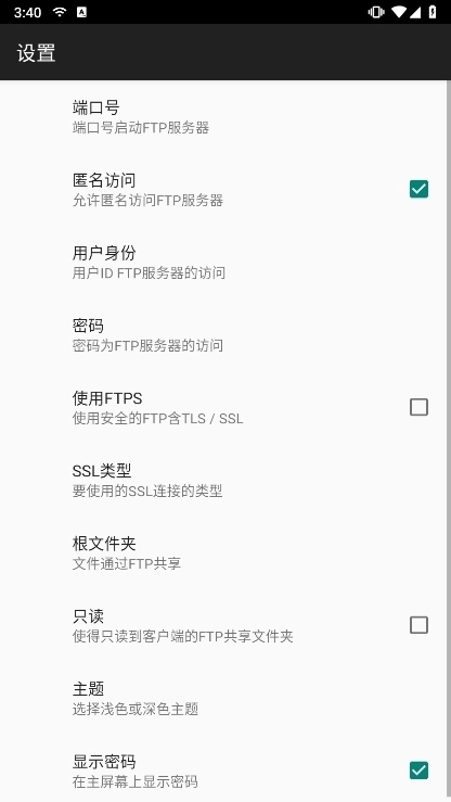 WiFiProFTPServer的中文名称是无线临FTP服务器,这款应用堪称手机端的FTP传输利器。有了它,就如同将FTP服务器随身携带,无论身处何地,只要有网络就能轻松传输文件,再也不需要依赖额外的USB数据线。它的功能十分完备:支持自定义端口号配置,还能选用FTPS加密传输方式,安全性十足;既允许匿名访问,也可以设置专属的用户名和密码来保护隐私;主文件夹的位置也能自由选择,灵活便捷。