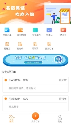 1、在线接单,技术员和各大汽车门店预约成功后就可以接单,为各大车主服务