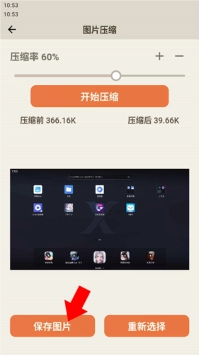 4、最后只需等待图片压缩完成,点击图片就能查看压缩效果;若对效果满意,点击保存图片即可将压缩后的图片存至本地;要是想重新压缩,点击重新选择就行。