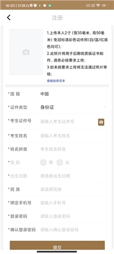 2、点击“考生注册”按钮,填写个人身份信息完成考生注册流程