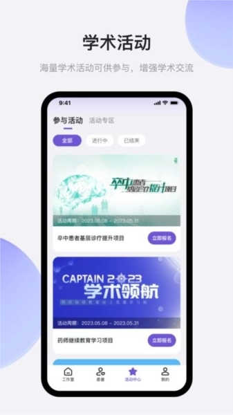 进入活动中心界面后,就能在线报名各类活动,学习医学知识。