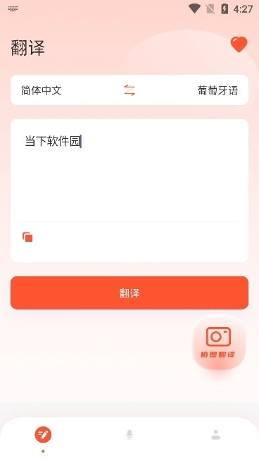 1、点击打开软件,无需复杂登录流程,直接跳转至翻译首页,首页清晰展示翻译输入框与功能按钮;