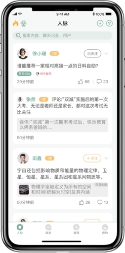 【人脉】:能够查看一度至六度(暂定为六度)人脉所发布的共享信息;可便捷地调整特定联系人、特定桥接人的信息量(包括增加或减少)。
