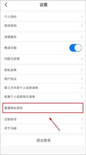 4、进入设置页面后,我们可以在这里修改一些自己账号的个人信息、清理缓存等功能。找到下方的“重置隐私密码”,注意即使是没有使用过隐私密码的用户也是显示为重置。