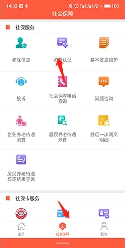 1、打开软件,点击底端的“社会保障”选项,然后点击“资格认证”选项。