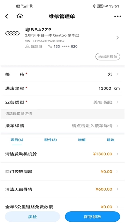 服务流程标准化:从接车、检测、报价到施工、交车,全程记录服务节点,支持上传检测报告或施工照片。