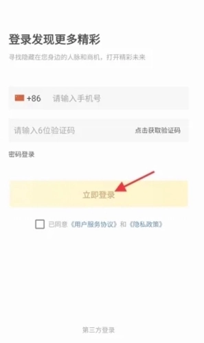 进入登陆页面后,用户可以选择输入自己的手机号接受验证码直接登录,未注册的手机号在首次登录后将会自动注册。