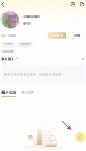 点击圈子的头像后进入圈子界面,想要发表内容可以点击页面的右下角黄色铅笔。