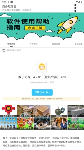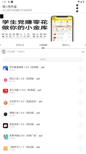 辉少软件盒安卓版功能强大,海量免费资源,涵盖软件大全、影视大全、小说应用、漫画中心、游戏专区等多个板块,所有资源均可直接使用。此外,它还汇集了众多网络及单机游戏的辅助工具,能解锁各类趣味功能盒子,助力用户更流畅地操作体验,堪称全网资源最丰富、最全面且独具特色的软件平台。