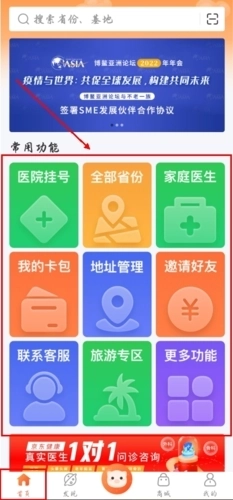 1、进入首页界面,首先映入眼帘的便是众多【常见功能】,这些功能能够帮助大家解决旅途中遇到的各类问题,像医院挂号、家庭医生、联系客服等都包含在内。