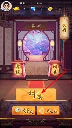 2、象棋玩法页面有考核、闯关、对弈、战好友、人机等,点击对弈;