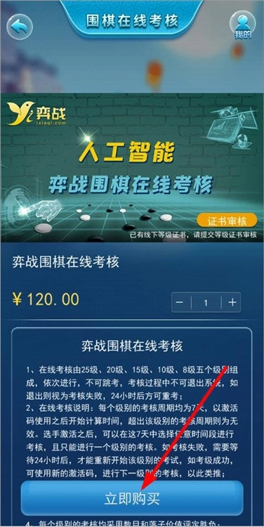 进入围棋/象棋等页面,点击【在线考核】,按25级、20级、15级等顺序依次考核,不可跳考。
