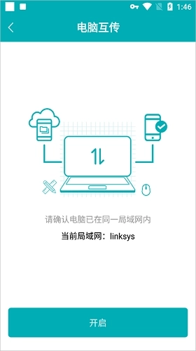 4、进入电脑互传页面后,点击“开启”;